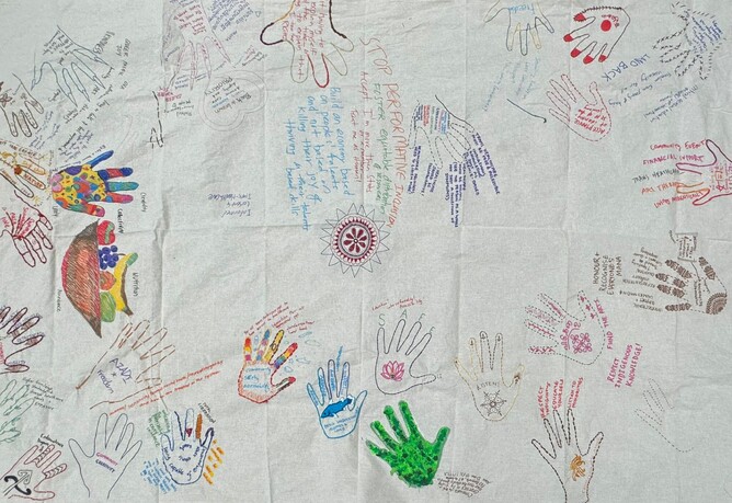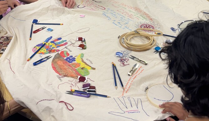 Threads of Us is a living, breathing community arts practice that interlaces creative expression, cultural identity, and collective healing within queer and people-of-colour (POC) communities across Aotearoa. Co-designed and co-facilitated by Nakshi Kantha artist Sahana Rahman and researcher/community advocate Cayathri Divakalala, with significant guidance and collaboration from our community members. It is not merely an arts project. It is a weaving of stories, gestures, the famous South Asian head wobbles, shared silences, and recommendations for service providers that explore what it means to belong, to resist, to rebuild together, and to thrive. Through its embodied workshops and digital sharings, Threads of Us has become both a site of artmaking and a philosophy in action: an ever-growing embroidery of care, resistance, reflection, and advocacy.