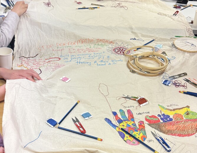 The chosen medium of embroidery is not incidental. Each thread becomes a gesture of care, a testimony to the belief that liberation and belonging are not solitary pursuits but shared creations. At its core, Threads of Us recognises that artmaking and healing are interwoven processes. The mindful rhythm of stitching, the shared quiet of collective storytelling, and the sensory experience of working with fabric all contribute to what Simran describes as “embodied presence”, a sense of being both grounded and witnessed in the present moment.