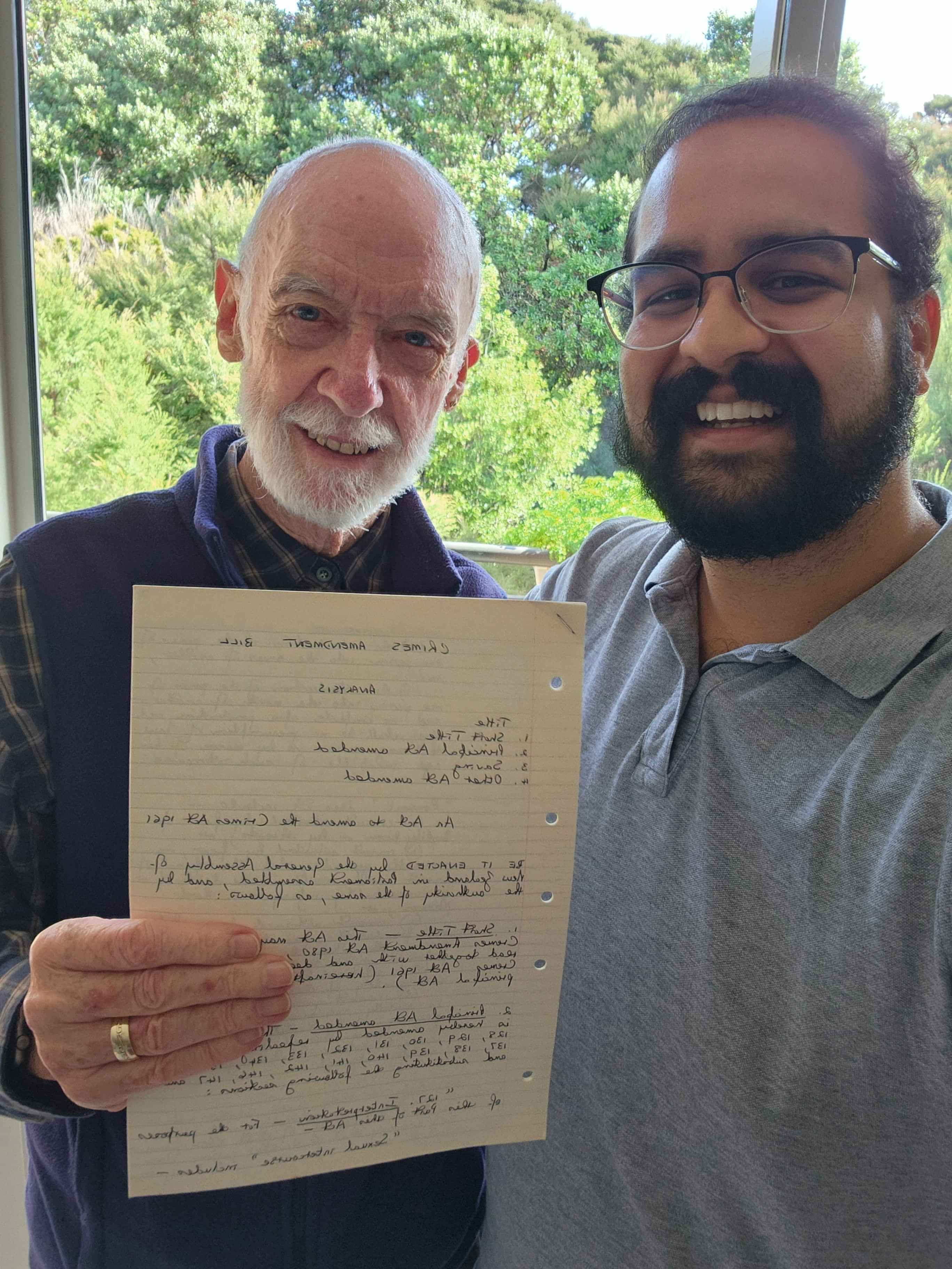 Gavin is just one of the many heroes of the LGBTI+ rights movement that I have met over the past two and a half years. There are too many to list, though I do want to make mention of three. Warren Lindberg, the Inaugural Director of the New Zealand AIDS Foundation (as it was then known) and later, a Human Rights Commissioner, has been incredibly generous with his time, knowledge and expertise of LGBTI+ legal history. He was instrumental in many of the HIV-related law reform efforts of the 1990s, and we owe him a world of gratitude. I am glad to call him a friend. Bill Logan, an LGBTI+ rights activist who contributed immensely to homosexual law reform, provided useful insights and narratives that helped situate my understandings of LGBTI+ law reform in this country. He is a LGBTI+ rights hero. Lastly, I wish to mention Professor Don McMorland. Professor McMorland was one of the two lawyers who drafted the bill that later became the Homosexual Law Reform Act 1986. He was also one of the two gay men featured in a 1979 article in the NZ Listener, which I am told, was unprecedented and helped contribute, in its own personal way, to the destigmatisation of homosexuality.[1] I met him in May 2024 as we trawled through his personal archive from the homosexual law reform era. In his archive, was a copy of the original bill. I took a photo of Professor McMorland and I, along with the draft (see opposite). It remains one of my most cherished images.
