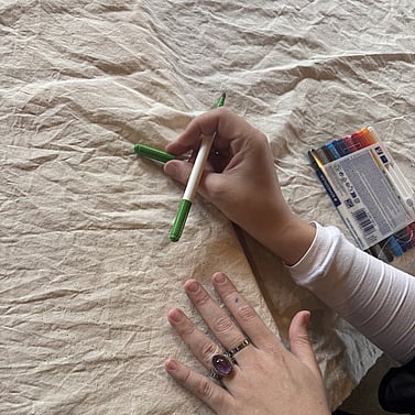 In the spaces I, Caya, co-create, the process of Nakshi Kantha embroidery is both symbolic and practical. It is a living metaphor for connection, care, and collective becoming. Together, participants trace their hands onto fabric and embroider those outlines into a shared Nakshi Kantha. Each stitch carries intention. It holds both individuality and interdependence, a quiet but radical act of presence.