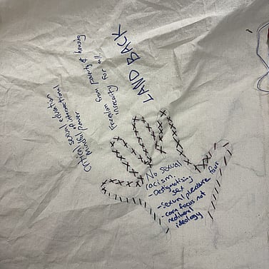 Together, we co-designed and led workshops that centred the voices of ethnic queer’s in a safe, slow-paced, creative environment. Participants traced and stitched their hands onto the kantha fabric, wrote reflections on healthcare and service providers in their palms and towards the embroidered sun motif (symbolising the life force in Nokshi Kantha). These workshops offered creative expression alongside emotional support and cultural connection through shared experiences. Holding space for ethnic queer people is vital, as we are often marginalised within both mainstream queer and ethnic communities.”